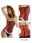 Made by satin fabrics, Stain less steel front busc and laces, Stain less steel bones and spiral in side the corset, white brass eyelets back to the corset, polyster laces, 100 % cotton jean lining.